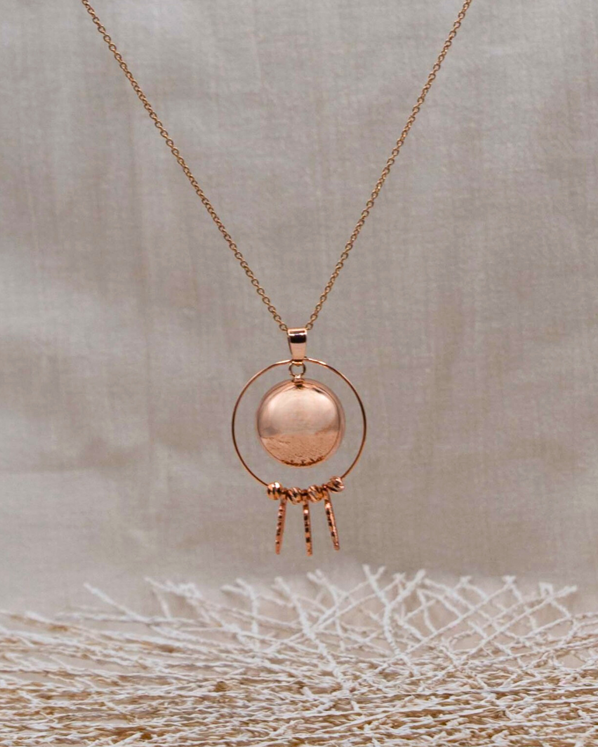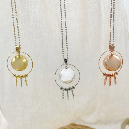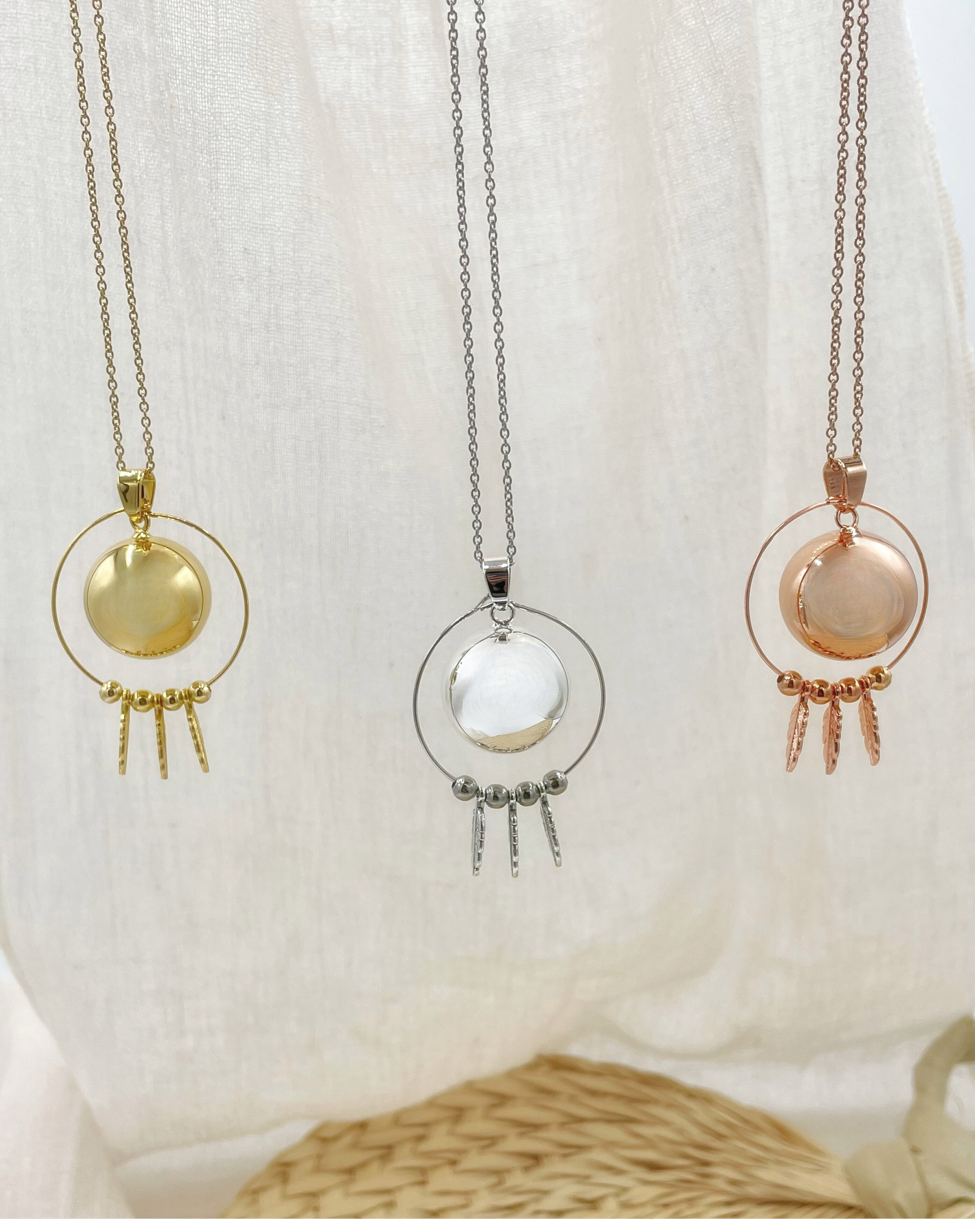 Nos bolas sont en cuivre, plaqué or 18 carats, argent 925 ou acier inoxydable, avec des chaînes en acier inoxydable.