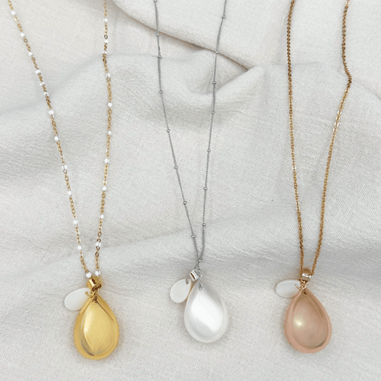 Nos bolas sont en cuivre, plaqué or 18 carats, argent 925 ou acier inoxydable, avec des chaînes en acier inoxydable.