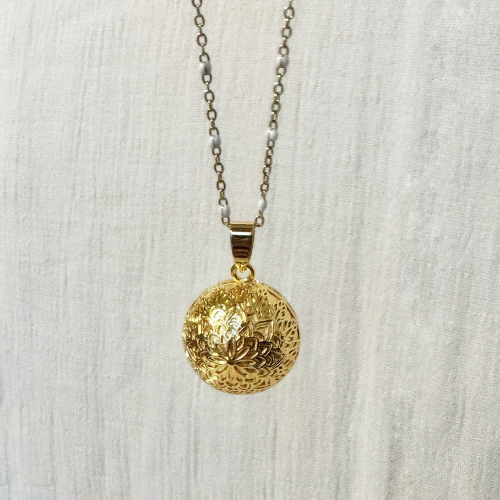 Le bola de grossesse "Cantik", qui signifie simplement Belle en Indonésien, est un bijou délicat orné de motifs style mandala. Sa douce mélodie accompagne la future maman à chaque mouvement et apaise bébé tout au long de la grossesse, et même après ! Ce bola sublime le ventre de la maman avec élégance et douceur.