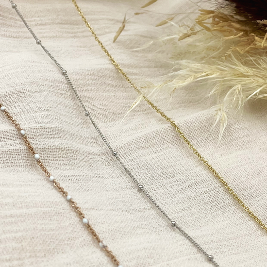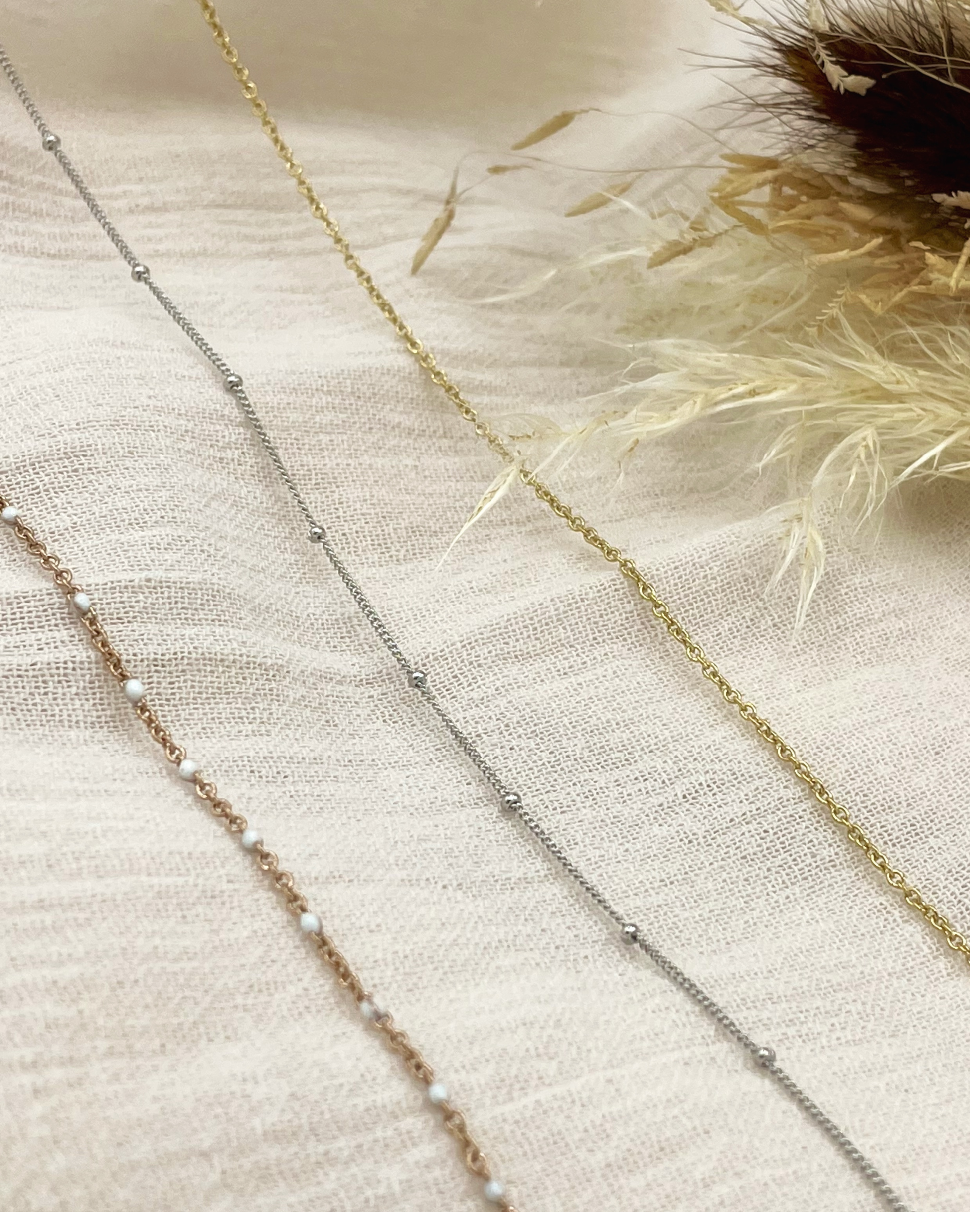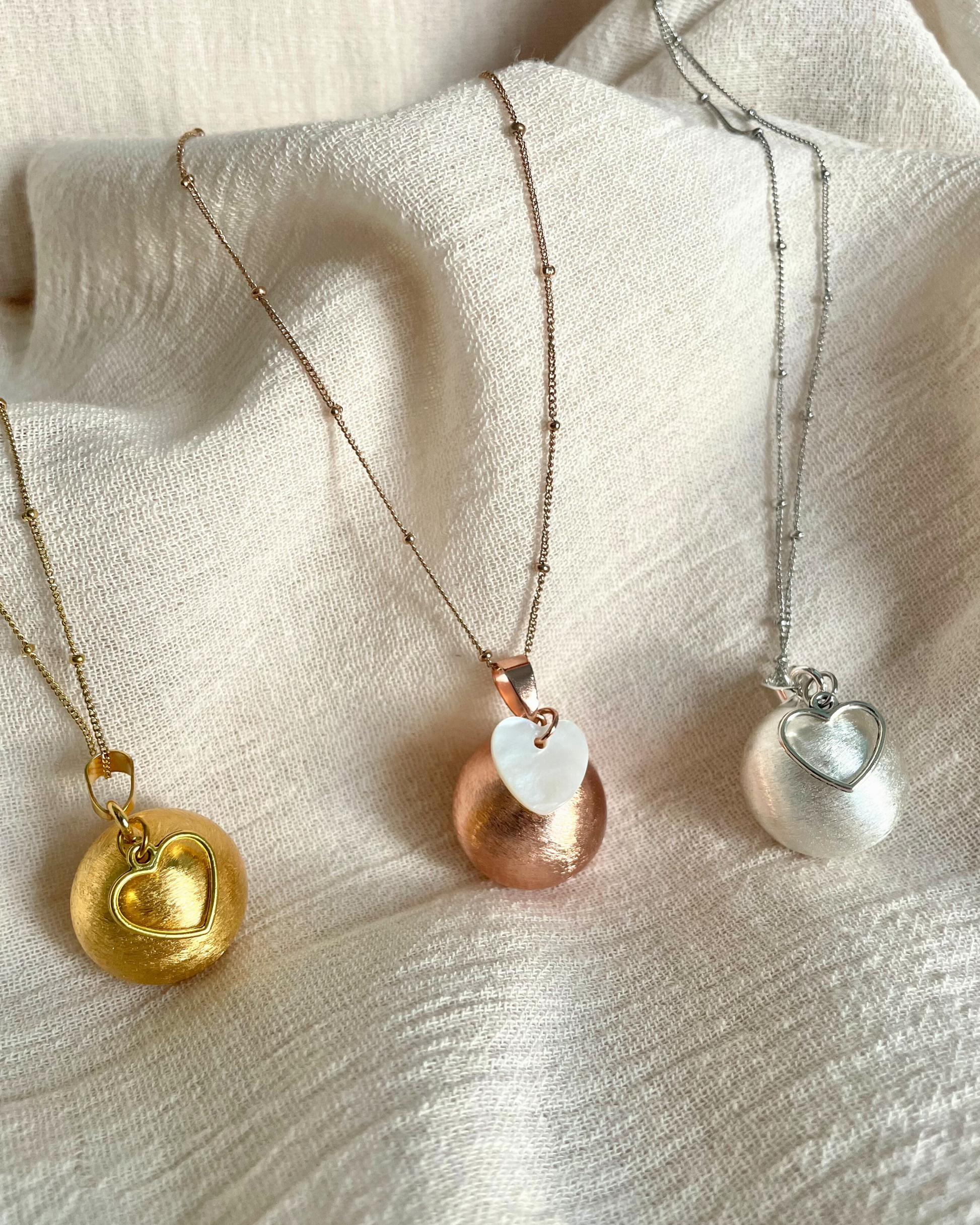 Nos bolas sont en cuivre, plaqué or 18 carats, argent 925 ou acier inoxydable, avec des chaînes en acier inoxydable.